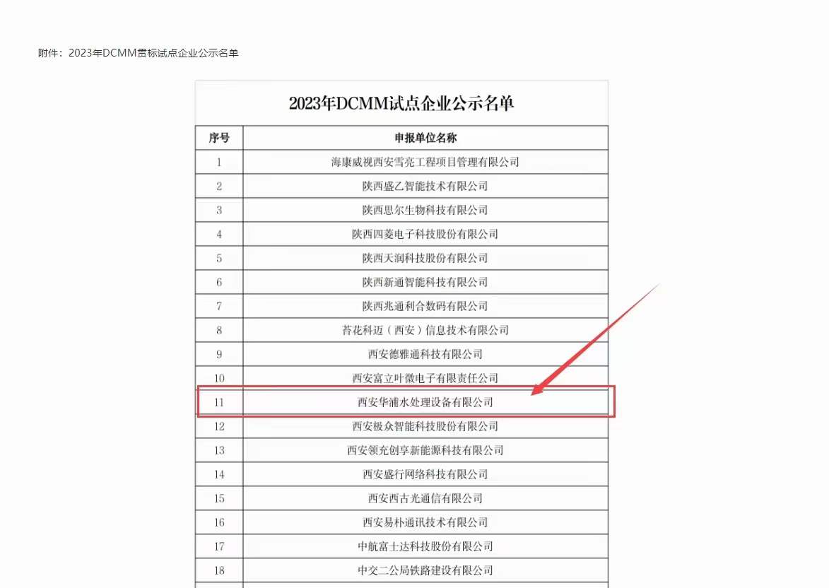 西安華浦水處理設備有限公司入選2023年度陜西省DCMM貫標試點企業,為水務系統數字化、網絡化、智能化發展貢獻華浦力量。